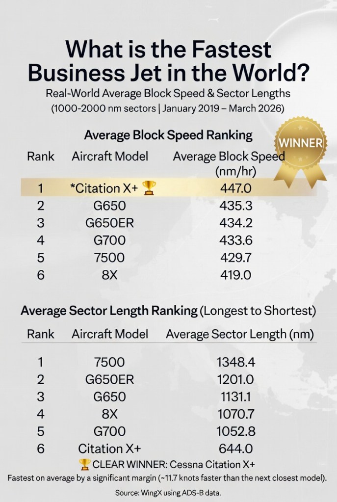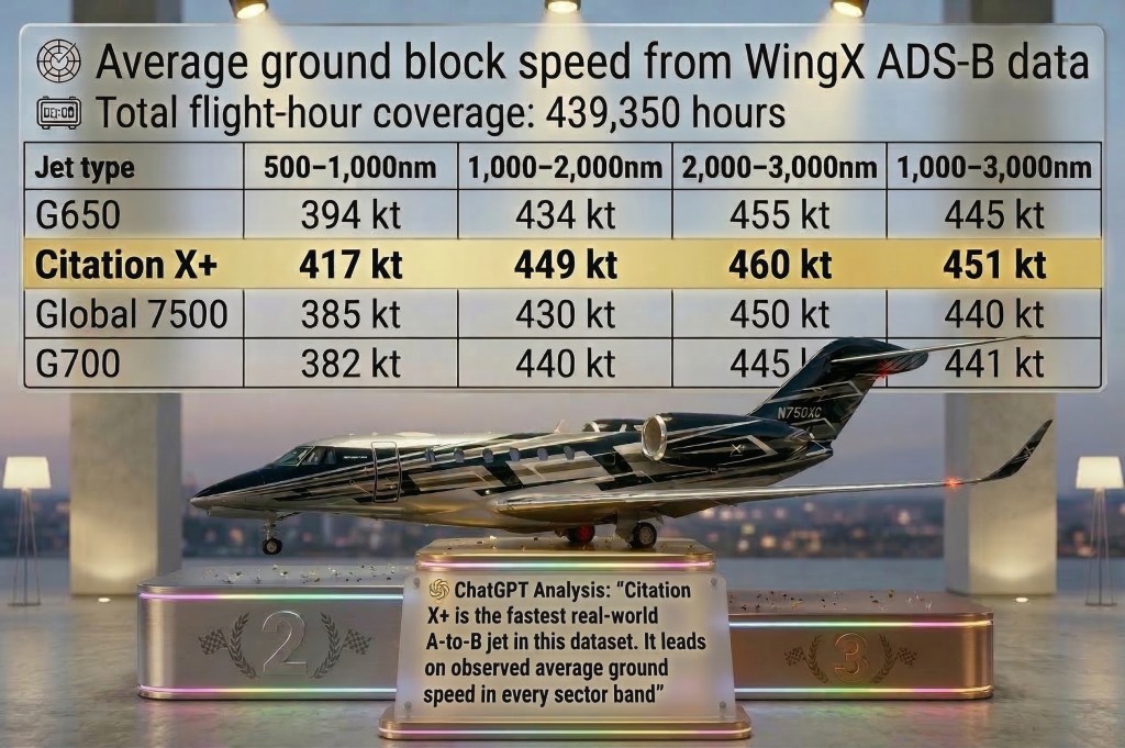 This is a clean knockout: the Citation X+ is the fastest real-world A-to-B jet in this dataset. It wins every sector band and leads the broadest core market, 1,000–3,000nm, at 451 knots.