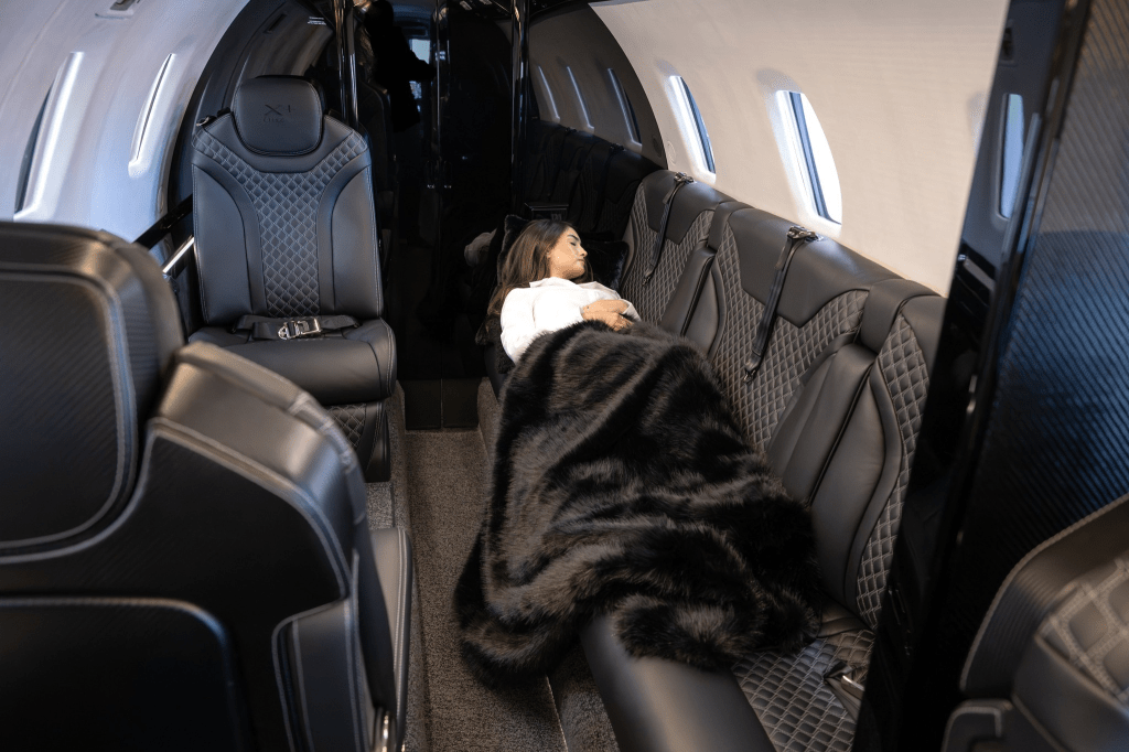 With class-leading capacity for 12 passengers — far surpassing the original X’s 8 — the X+ Luxe features six custom lie-flat, berthable seats with footrests, a three-seat divan separated by a carbon fiber divider and curtain, plus a side-facing seat, jump seat, belted lavatory, and three carbon fiber tables. Unique acoustic curtains for the door, cockpit, and second zone create a super-quiet cabin outperforming the Challenger 3500, enhanced by an Alto surround sound system for immersive audio.