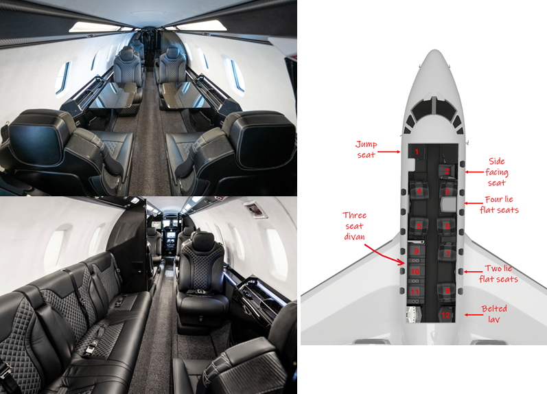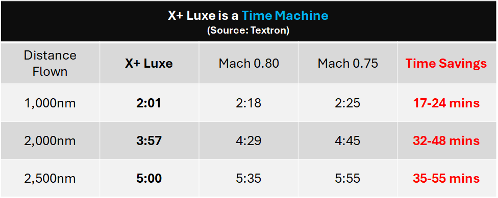 The two tables below compare the X+ Luxe to its main rivals, the Challenger 350 and the Longitude. In short, the X+ Luxe carries more people in more luxury and gets you there a lot faster. If time is your edge, choose the X+ Luxe.